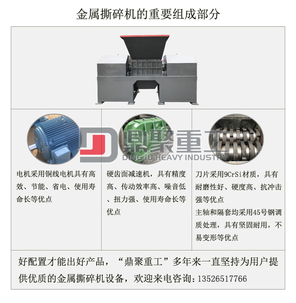 由于用戶在使用金屬壓塊撕碎機時對產量、出料大小以及所要撕碎不同金屬物料的要求,撕碎機在配置時,刀片的大小、齒數的多少都會有所不同,這都影響著撕碎機各方面的參數,因此撕碎機有時會出現相同型號但是技術參數不同的情況,具體技術參數歡迎來電咨詢,我們可以根據您的需求為您提供適合自身的金屬撕碎機設備。