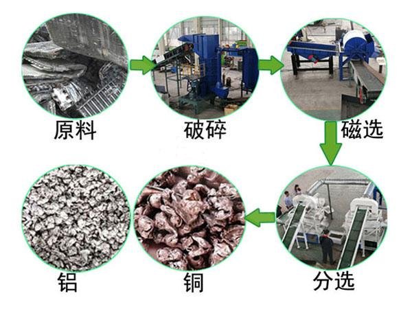 舊散熱器銅鋁破碎分離生產線是通過撕碎機、破碎機、磁選機、氣流比重分選機等一系列設備組合而成: