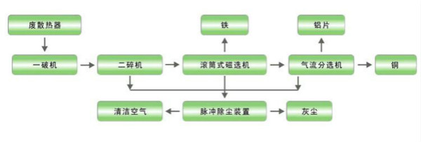 散熱器片銅鋁分離生產線適用于廢舊汽車水箱,空調水箱,散熱器片,暖氣片等鋁,銅,鐵,塑料的分離,具有98%以上的回收率,能使我們在有限的資源中有效的使用更多的銅鋁制品,比人工拆解或用其它方法都很有效。